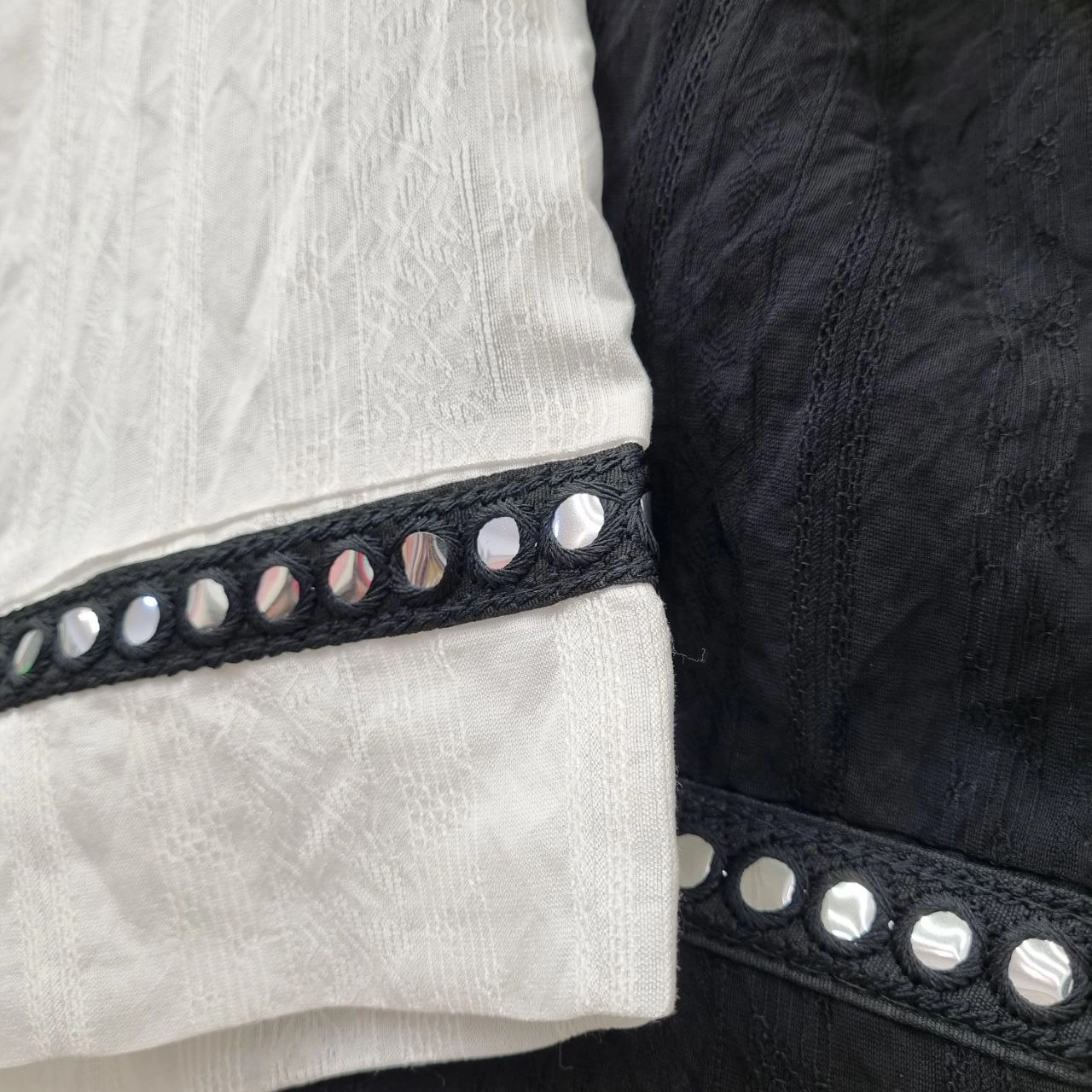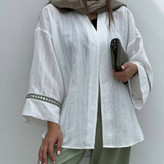 لطفا توجه بفرمایید قسمت گیپور سر آستین ها رنگ مشکی می باشد/ سرآستین گیپور و آینه دوزی/ جنس فونیکس نخ بسیار لطیف و خنک/ فری سایز/ تا سایز ۵۰/ دور سینه در حالت روی هم امده حدود ۱۲۰/ قد حدود ۷۲